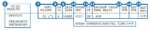 - «FARE» - тариф (например, «GOW», где G – класс бронирования, а OW – обозначение направления «в одну сторону»);